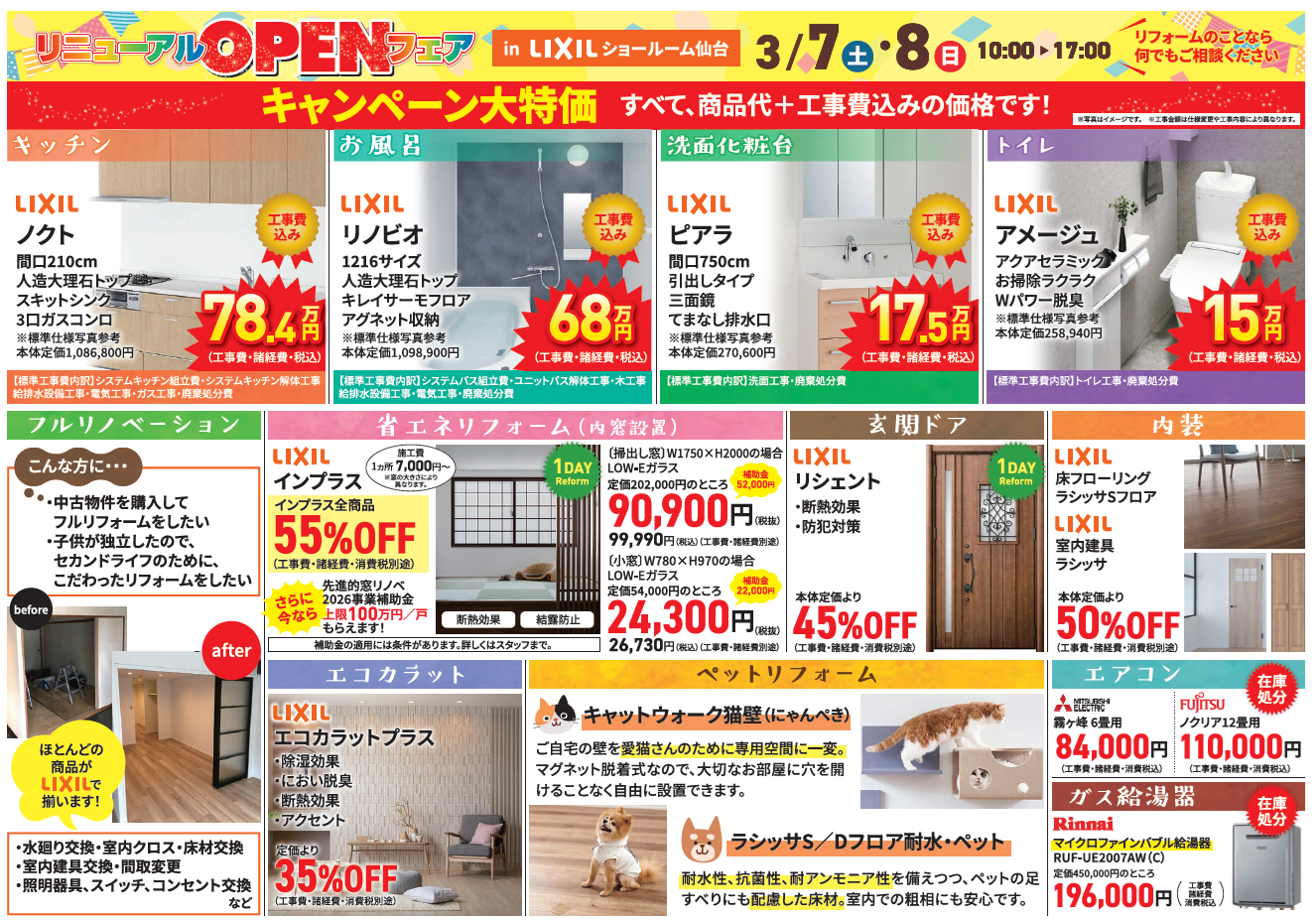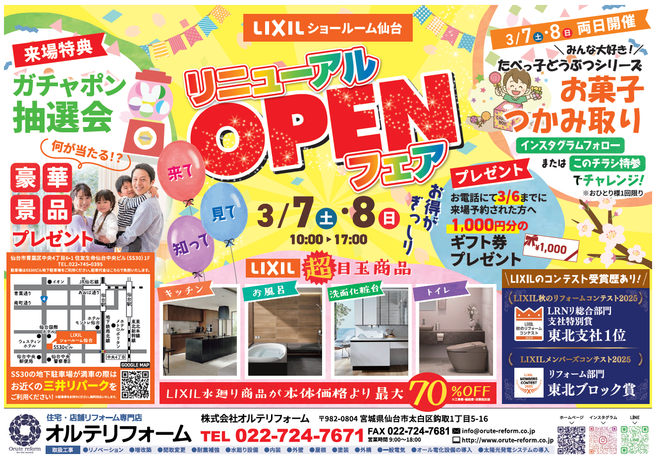 3/7(土)・3/8(日)の2日間におきまして、LIXILショールーム仙台リニューアルOPENフェアを開催いたします。