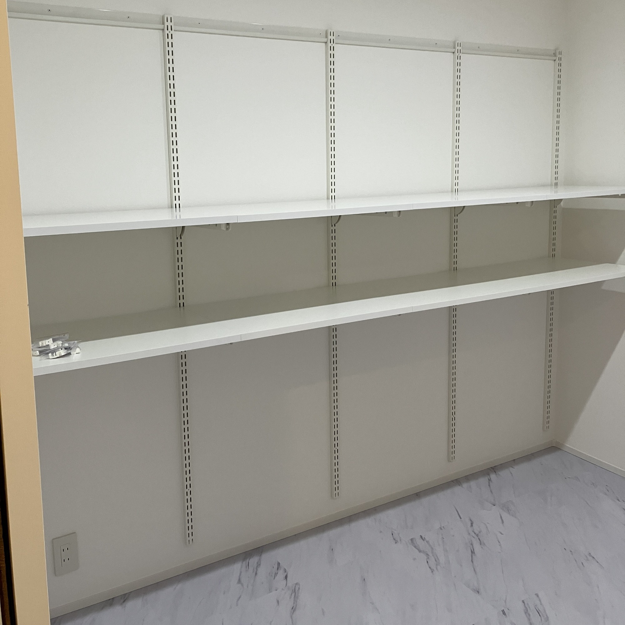 また、わんちゃん用の小部屋には邪魔にならない可動式の棚を設置し、わんちゃん用品を置くのに大変重宝しています。